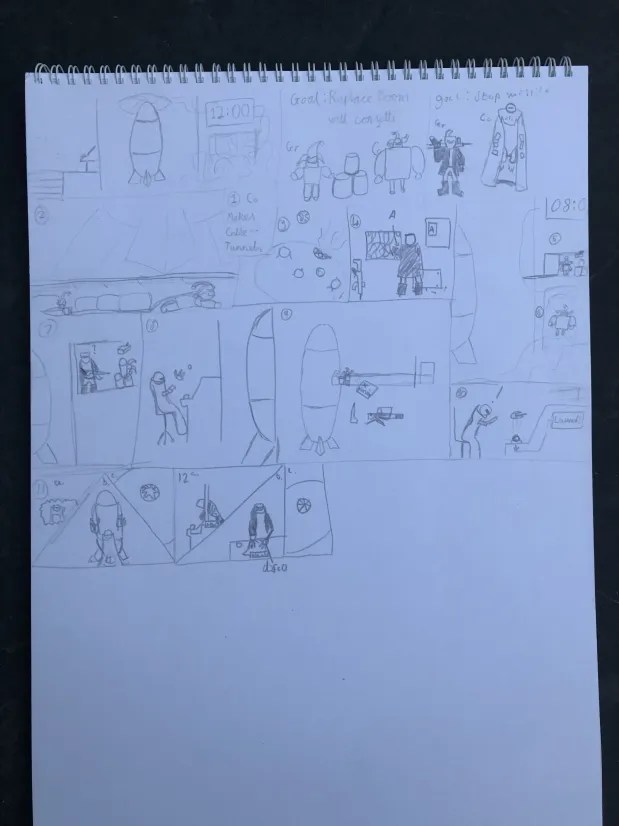 Turn 7: My brother feels there is little for him to do at this point so has his cyborg wander around the silo. Unfortunately he misreads a previous panel and drew his cyborg between the barrels and the door, where my Grounded was. But now Grounded clown is hiding on the opposite side of the barrels. (This was my brother’s second mistake.)